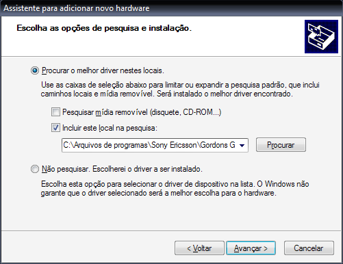 Feito isso, o Windows reconhecerá o seu celular como um novo hardware, abrindo uma janela de 'Assistente para adicionar novo hardware'. Marque a opção "Instalar de uma lista ou local específico (avançado)" e clique em Avançar >. Desmarque a opção "Pesquisar mídia removível (disquete, CD-ROM...)" e marque "Incluir este local na pesquisa:". Digite este caminho:"C:\Arquivos de programas\Sony Ericsson\Gordons Gate"
